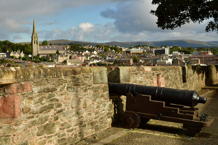 Derry, North Ireland. Aerial view of Derry Londonderry city center in Northern Ireland, UK. Sunny day with cloudy sky, city walls and historical buildings