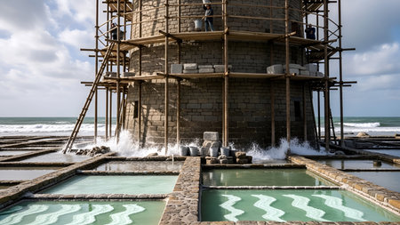 A stunning water desalination facility located by the ocean showcases sustainable solutions under natural lighting, highlighted by smooth water surfaces and rustic charm.