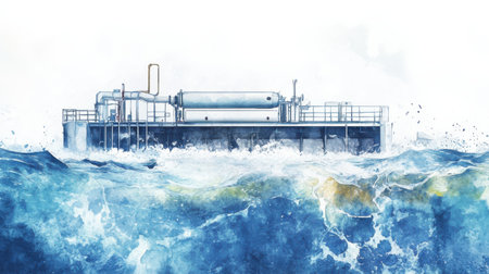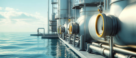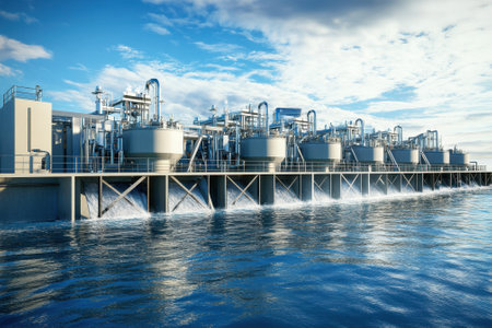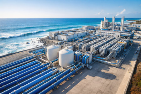 A modern desalination facility thrives by the ocean, showing sustainable technology in a naturally lit environment, reflecting innovation and environmental stewardship.