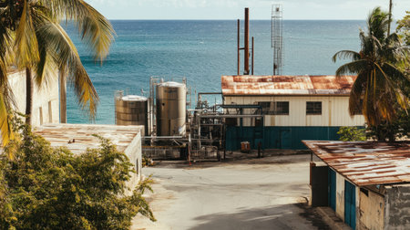 An industrial facility located by the coastal shore features towering equipment and palm trees, showcasing a blend of nature and industry under a clear sky.