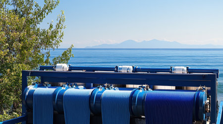 This image captures a modern water filtration system positioned by the ocean, showcasing blue tanks against a stunning backdrop of mountains and a clear sky, emphasizing clean water technology.