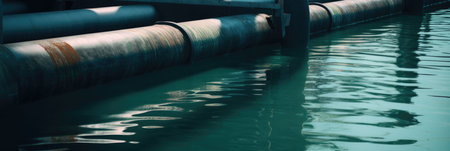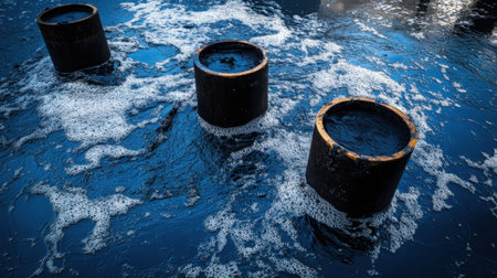A striking image of circular black drums surrounded by foamy water, capturing the essence of an industrial scene at dusk. The interplay of colors and textures evokes a sense of depth and motion, making it a perfect choice for environmental themes.