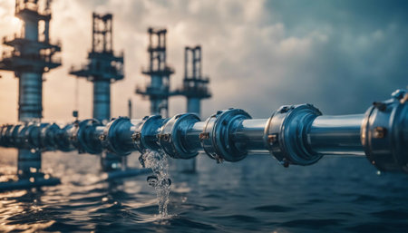 Pipes Extend From an Industrial Vessel Alongside Churning Ocean Waves During Twilight Hours, Showcasing Engineering and Maritime Operations. Generative AI