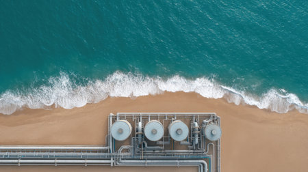 A captivating aerial view showcasing industrial infrastructure next to a sandy beach, with clear blue waters and gentle waves creating a stunning contrast.