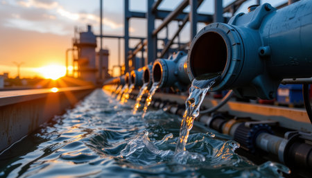 A clean water flowing from industrial pipes at sunset creates serene atmosphere. vibrant colors reflect on water surface