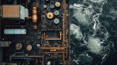 Industrial pipework and turbulent ocean waves at dockside, dramatic aerial perspective