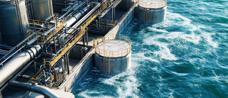 An expansive view reveals a modern water treatment plant tirelessly processing ocean water, embodying sustainable living in a coastal city.