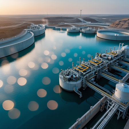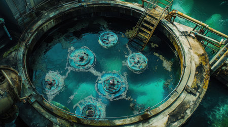 A captivating aerial perspective of an industrial water treatment facility showcases circular tanks immersed in vibrant water, reflecting the merging of engineering and environmental stewardship.