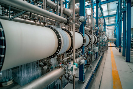 Inside a modern water treatment facility, large pipes and filtration systems are arranged neatly. The environment is clean and organized, reflecting efficiency in water processing operations.