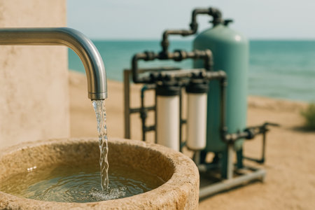 Seawater purification system operating outdoors with clean water flowing from faucet into basin near a coastal environment.