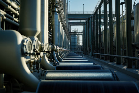 Metal pipelines stretch through the industrial facility under a bright sky, showing a complex network of machinery.