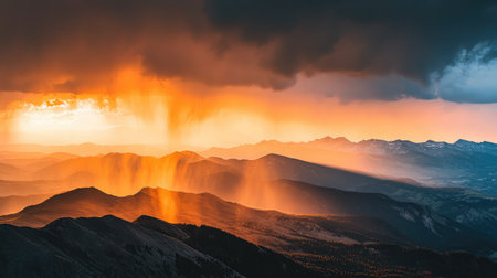 A dramatic sunset over a mountain ridge, casting golden light over the peaks.