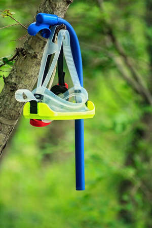 Water mask and breathing pipe hanging on the tree on green forest natural background. Diving accessories as a sign of summer sports, recreation activities and seaside leisure.