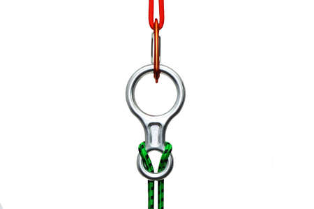 Red carbine with clutch. Equipment for climbing and mountaineering. Safety rope. Knot eight.