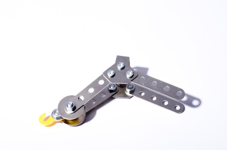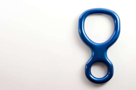 Active sports. Isolated photo of climbing equipment. Part of carabiner lying on the white and grey colored table.