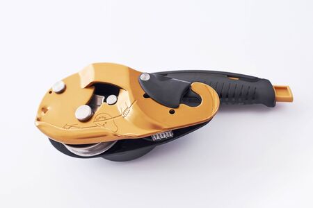 Ukraine, Migea - July 30, 2017: Automatic brake unit Head Rush Zip Stop for high-speed lines Zipline and for trolley lines. Equipment for safe trolling on a steel cable. Roller for high-speed zipline.