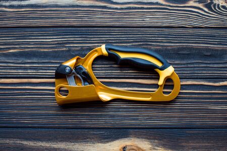 Isolated photo of climbing equipment. Part of carabiner lying on the wooden table.