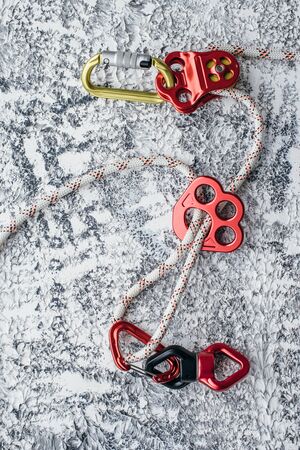climbing equipment folded on an orange rope. modern equipment for climbing in the mountains. adventure on the rocks.