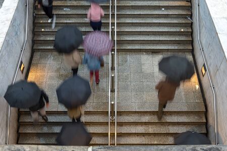 overhead view of people walking towards and away from the entrance to the underground train station under rain with umbrellas - bad weather