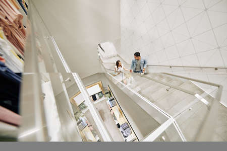 Young couple with paper-bags walking up the third floor of department store, view from above