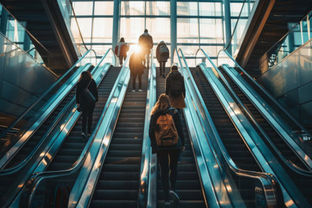 Commuters are making their way up shining escalators as the warm golden light filters through the terminal