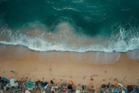 Aerial view of a polluted beach covered in plastic waste. Highlighting the devastating impact of human activities on marine environments and the urgent need for sustainable waste management practices