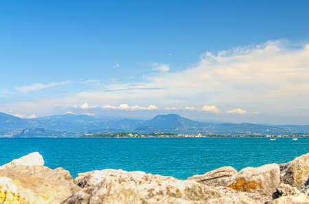 View from stone pier mole of Garda Lake azure water with Monte Baldo mountain range and Sirmione peninsula, blue sky white clouds background, Desenzano del Garda town, Lombardy, Northern Italy