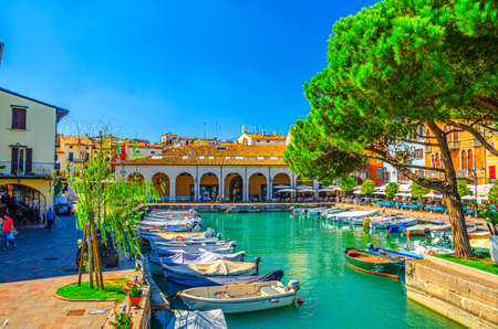 Desenzano del Garda, Italy, September 11, 2019: Old harbor with boats on turquoise water, green trees, street restaurants and traditional buildings in historical town center, blue sky, Lombardy
