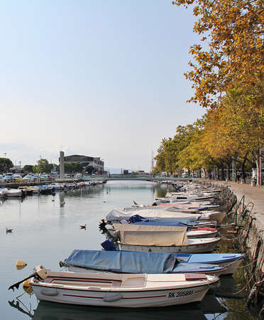 Touristic harbor at Peschiera del Garda along the cycleway of Mincio river, Verona province, Veneto, Italy, at summer