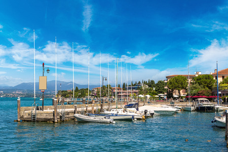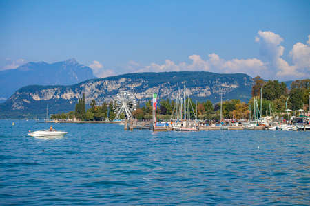 August 1, 2016, Garda Lake (Lago di Garda), Northern Italy. View from city of Desenzano del Garda on sunny summer day. Natural background. Landscape. Desenzano del Garda port.