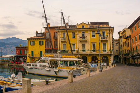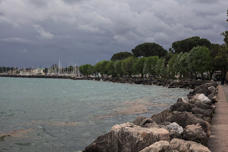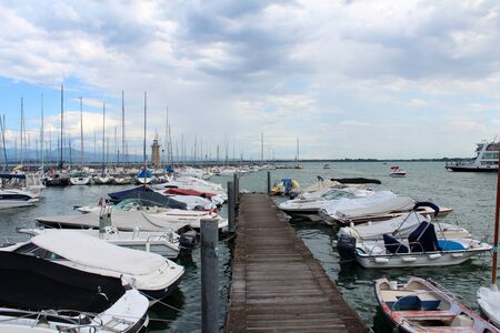 Desenzano del Garda, Italy - 09 May 2016: Views of the city bay with boats in the foreground at cloudy weather