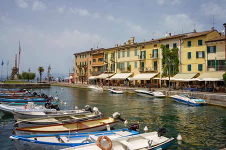 Desenzano del Garda, Italy, September 11, 2019: Old harbour Porto Vecchio with boats on turquoise water, street restaurants and traditional buildings in historical town centre, Lombardy
