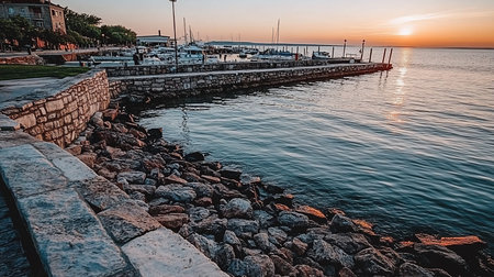 A tranquil sunset view of a harbor with moored boats, captured from a stone embankment. The water reflects the warm hues of the setting sun, creating a peaceful atmosphere.