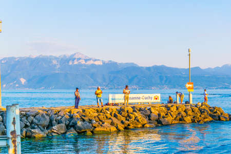 LAUSANNE, SWITZERLAND, JULY 18, 2017: Group of men is fishing on a pier in Lausanne, Switzerland