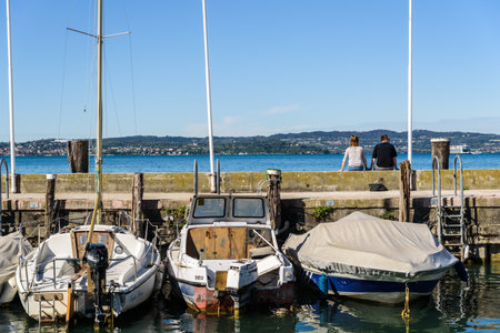 Sirmione, Italy - September 24, 2021: A couple rest in the port of Sirmione among the hulls of sailboats.