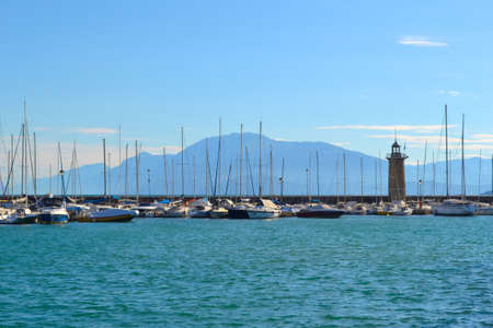 Lake landscape with sailboats, lighthouse, blue water, white clouds, mountains in haze. Lake Garda in Italy. Vacation concept