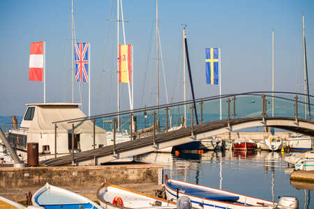 Desenzano del Garda, Italy - September 22, 2021: View of the small old port of Lake Garda a sunny day in Desenzano.