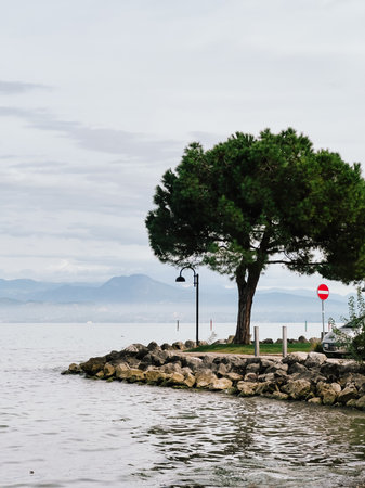 Scenic view of lone pine tree growing on rocky shore of Lake Garda, with mountains visible in distance under cloudy sky, creating tranquil and picturesque scene.