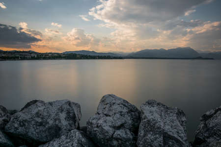 Portese, Italy, beautiful sunset above water at Lake Garda