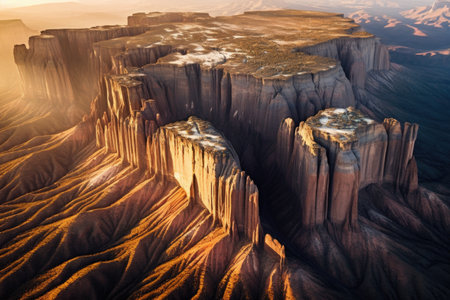 aerial view of layered sandstone formations at sunset, created with generative ai