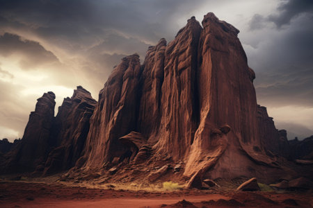 AI Generated. rocky desert landscape with towering sandstone formations dramatic light and shadow play vast sky copy space
