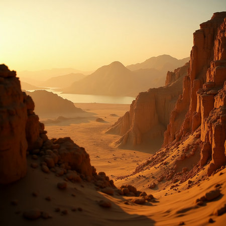Breathtaking golden hues illuminate rugged mountains and vast deserts, echoing tales from ancient biblical lands, with Hebrew cultural significance woven into the landscape.