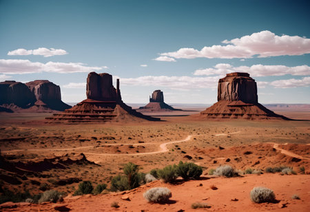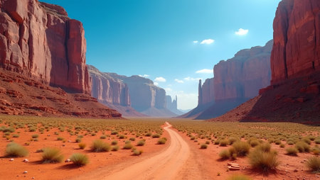 AI Generated. Desert Landscape with Rugged Cliffs and a Dusty Road