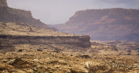 Vast stretches of rocky desert reveal towering cliffs under a hazy sky, with earth tones creating a mesmerizing contrast that invites exploration and adventure in this tranquil wilderness.