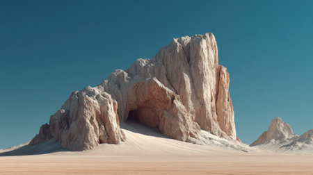 A striking rock formation towers over the sandy desert, showing its textured surface and geological features under a bright blue sky. The landscape exudes a serene and vast atmosphere.