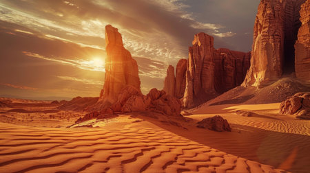An awe-inspiring image suitable for environmental publications, travel brochures, or as a dynamic background in nature-centered design projects | This photograph showcases the tranquil beauty and grandeur of desert landscapes during the golden hour. As the sun casts a warm, golden light, it accentuates the intricate layers and textures of the sandstone formations, which rise dramatically from the soft sandy floor. The gentle curves and smooth slopes of the dunes complement the rugged outlines of the weathered rock, creating a visual symphony of shapes and forms. The contrast of these elements embodies the resilience and timelessness of nature's handiwork in arid environments. A clear sky enhances the feeling of openness and solitude, inviting contemplation about the expansiveness of natural landscapes. The play of light and shadow depth adds, drawing the eye across the scene to explore each detail | This image is perfect for decor that aims to convey a sense of adventure and the beauty of solitude in the natural world. It could serve as a stunning visual storyteller in a documentary about desert climates or be used to inspire themes of persistence and adaptation in motivational content. For environmental advocacy, it's a poignant reminder of the planet's diverse ecosystems that require conservation. The photo's ample negative space makes it suitable for text overlays, ideal for editorial use or as a compelling cover image | A breathtaking photo of desert rock formations bathed in the golden light of sunset, offering both awe and peace, highlighting the intricate details of the sandstone and the sweeping desert floor beneath