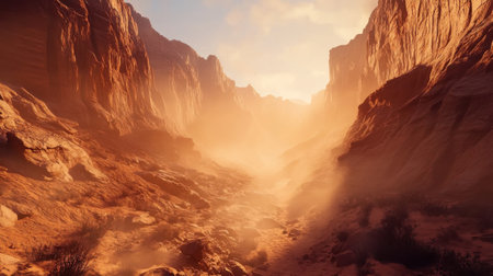 A breathtaking canyon landscape is bathed in warm light during sunrise. Dust particles float in the air, creating an ethereal atmosphere, as rugged cliffs rise on either side of a dry riverbed.