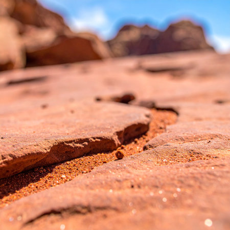 A close-up perspective reveals a deep crack in ancient red sandstone, a testament to the slow, powerful forces of time and erosion.