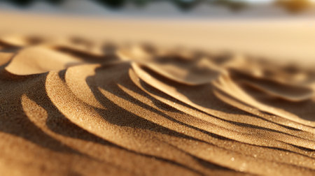 Close-up view of sand dunes showing distinct wave patterns created by wind. The texture is granular with soft shadows highlighting the undulating...