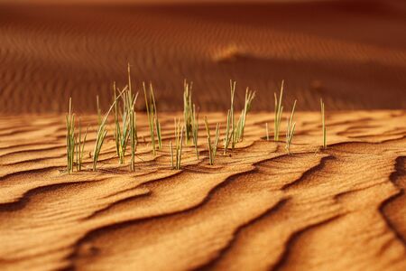 Sand dunes in the desert at sunset near Dubai, United Arab Emirates. Selective focus. Abstract natural background. Waves on the yellow sand